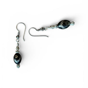 Dangle earrings with antique black coral beads with intricate silver inlay from an old prayer strand.