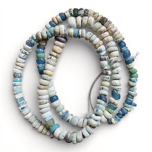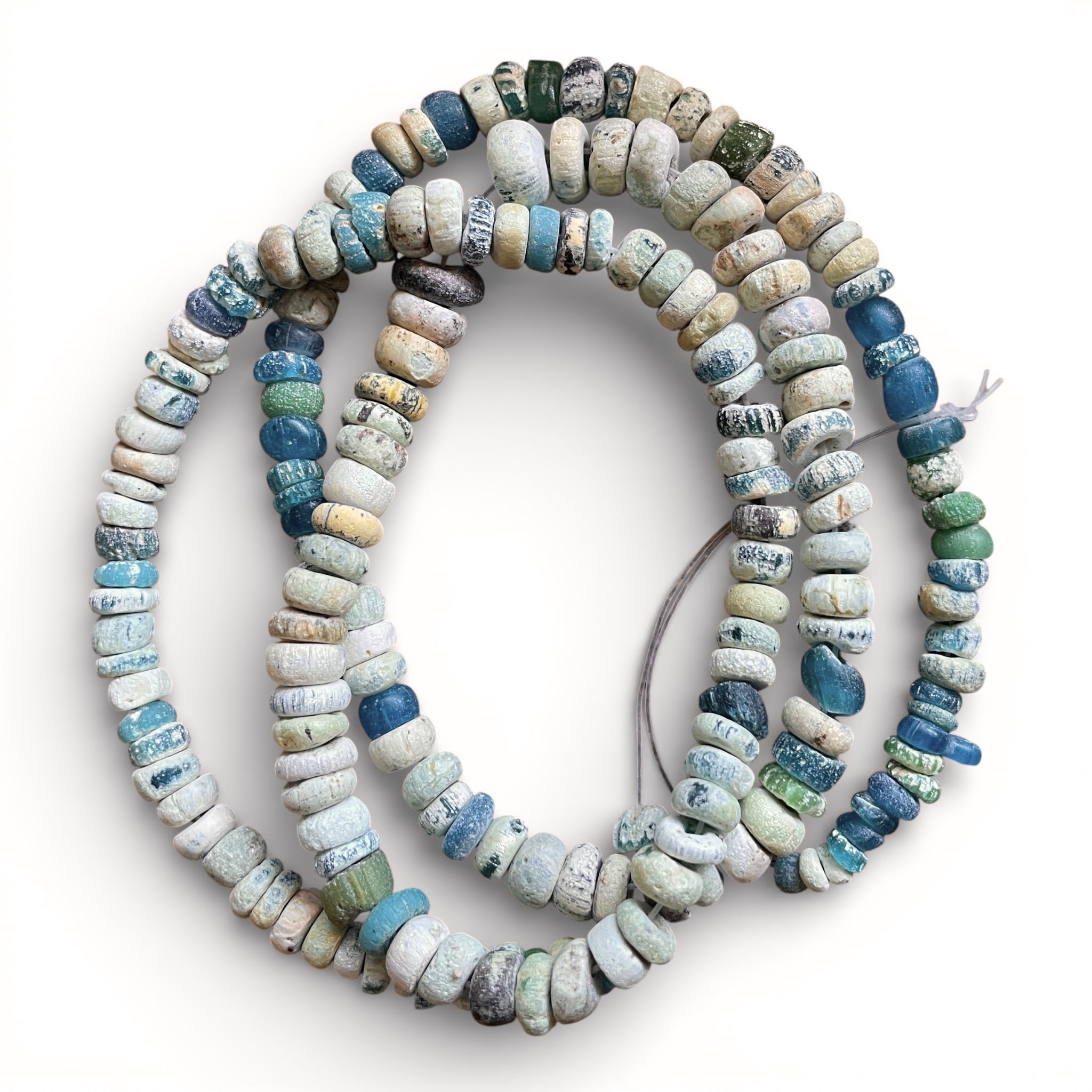 A very pretty strand of excavated teal and pearly white medium glass nila beads.