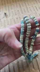 A favorite strand due to the variation in teal beads, the pearlized  appearance of many of the white and off white beads and the lovely wear on all of the beads on this strand.