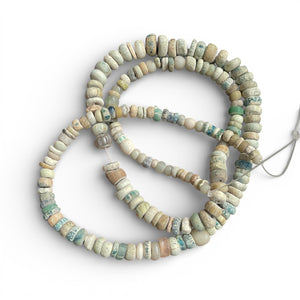 Strand of excavated blue, and white medium glass nila beads mixed with a few pearly antique glass beads from the West African trade.